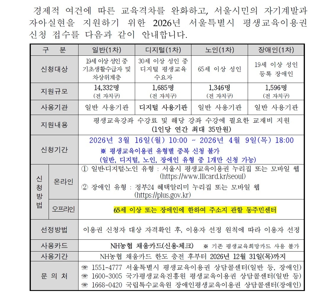 2026년 서울특별시 평생교육이용권 1차 신청접수 안내