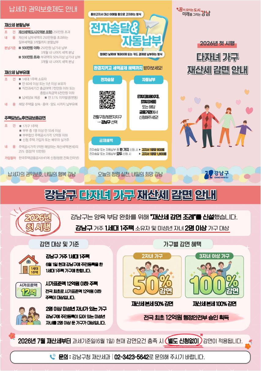 2026. 3. 6.(금) 「서울특별시 강남구 구세 감면 조례」가 전부개정됨에 따라 신설된 재산세 감면 규정에 대해 적극적으로 안내·홍보하고자합니다.