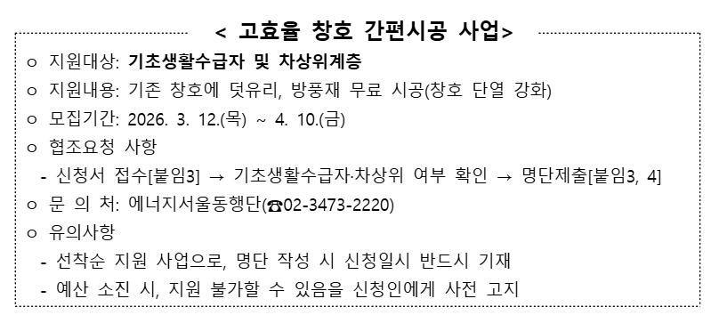 2026년 고효율 창호 간편시공 희망가구 모집(기초생활수급자 및 차상위계층 대상)