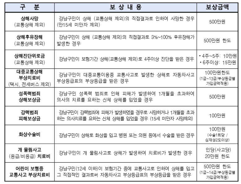 일상생활에서 발생할 수 있는 예기치 못한 재난 및 사고로부터 최소한의 생활안정을 지원하고자 『2026년 강남구 구민안전보험』을 아래와 같이 운영하오니 참고하시기 바랍니다.