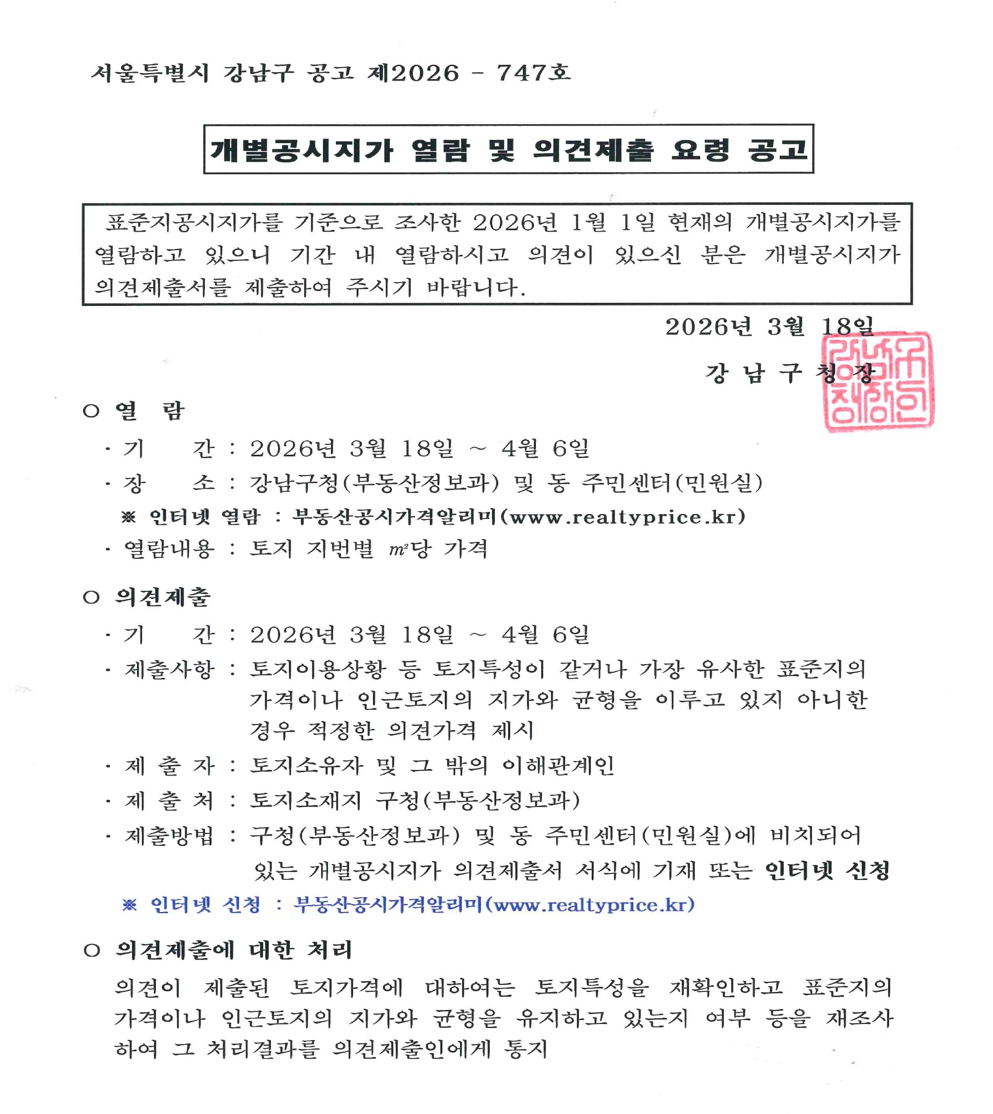 2026년 개별공시지가 열람 및 의견제출 안내