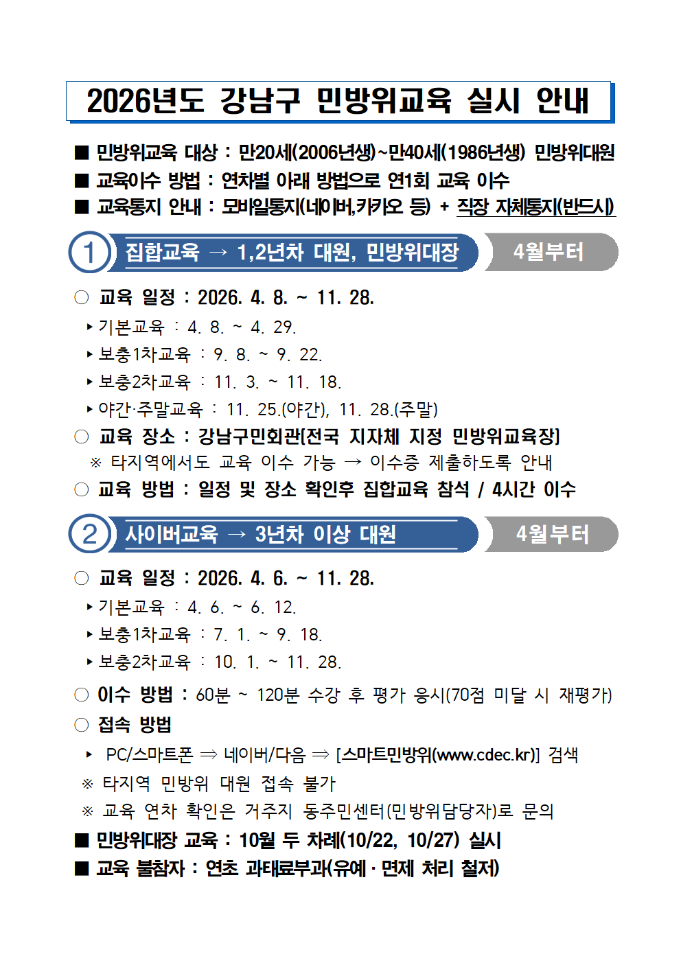 붙임 : 2026년 강남구 민방위 집합교육 세부일정 안내