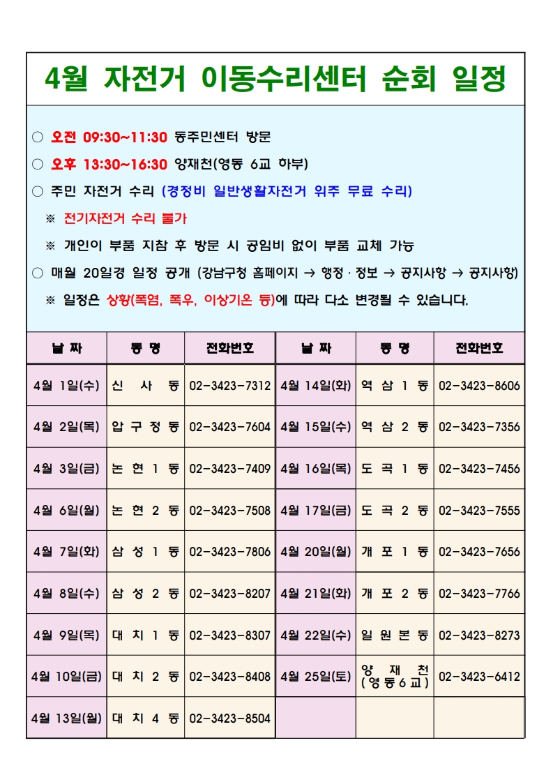 2026년 4월 강남구 자전거 이동수리센터 일정 안내