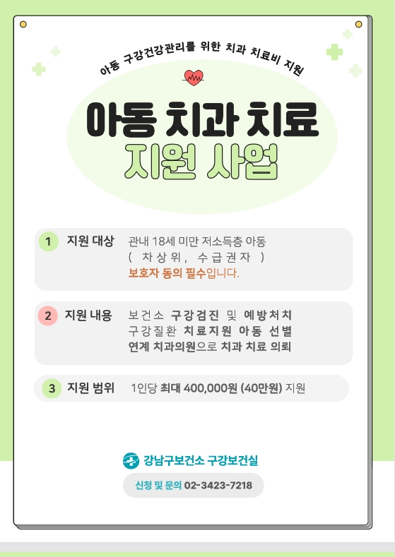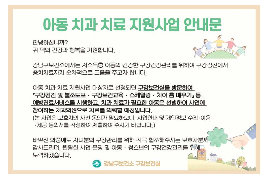 - 보건소 구강검진 및 예방진료 후 구강질환 치료지원 아동을 선별 하여 참여 치과의원으로 치과 치료 의뢰 (충전 및 치수 치근단 치료 등의 보존 처치, 발치 등) - 지원범위 : 1인당 최대 400천원 이내 ※ 예산소진 시 마감 |