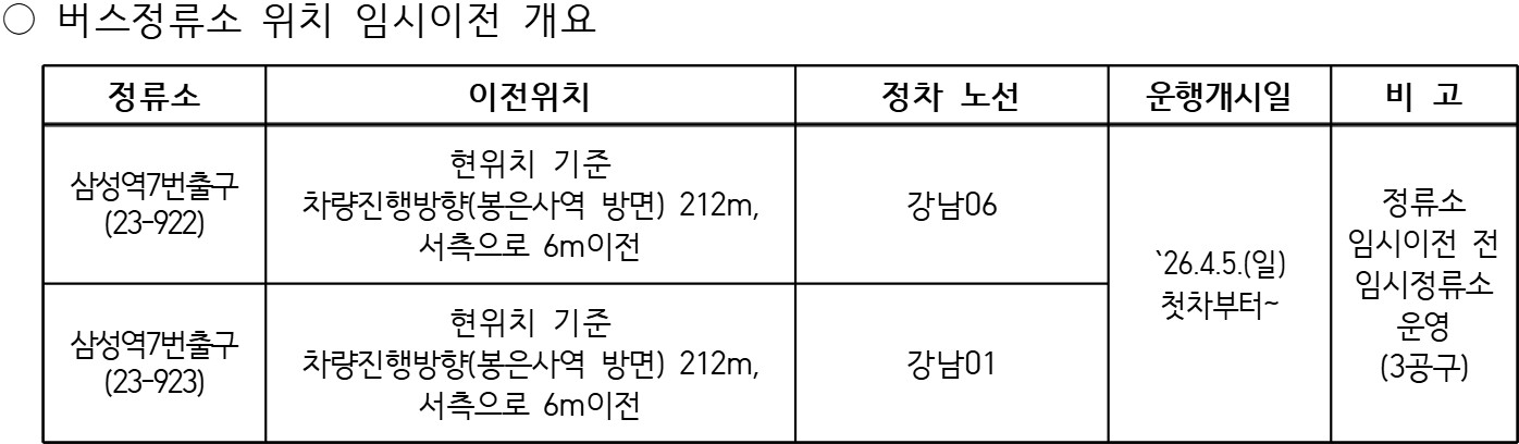 우리 구 「영동대로 지하공간 복합개발 3공구 건설공사」 공사구간 내 저촉되는 마을버스정류소 임시이전 및 설치에 관하여 안내드립니다.