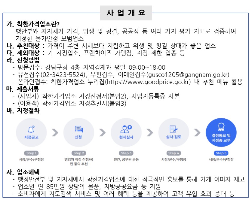 우리 구에서는 저렴한 가격과 양질의 서비스로 지역 물가 안정에 기여하고 있는 업소를 「착한가격업소」로 지정·운영하고 있습니다.