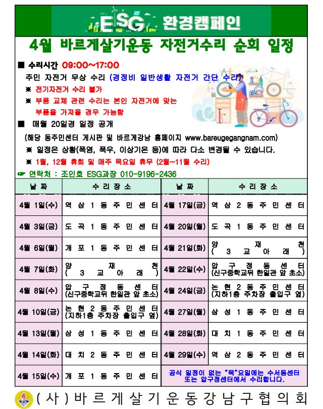 4월 바르게살기운동 자전거수리 일정