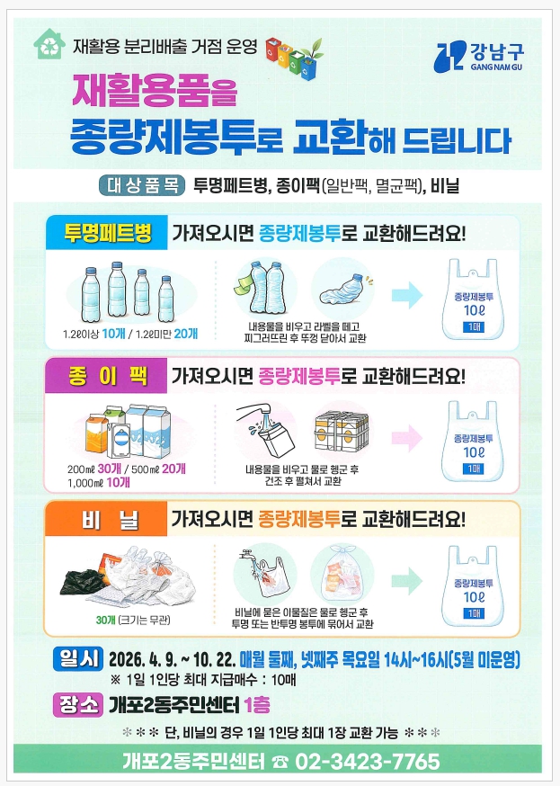 투명페트병 1.2ℓ 50개, 비닐 60개 ==> 종량제 봉투 6매 지급