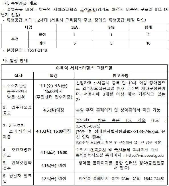 야목역 서희스타힐스 그랜드힐 서울시 장애인 특별공급 기관추천 안내