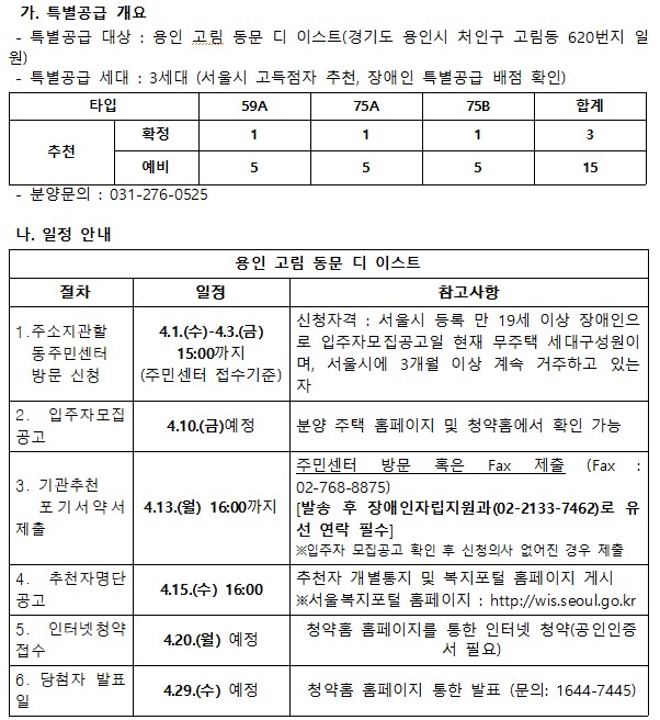 용인 고림 동문 디 이스트 서울시 장애인 특별공급 기관추천 안내