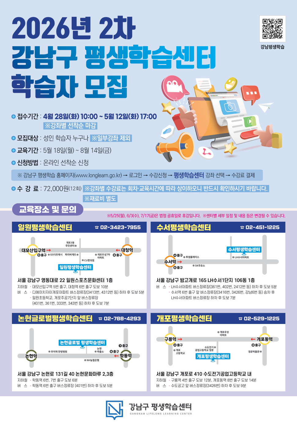강남구 평생학습센터 「2026년 2차 학습자 모집」 안내