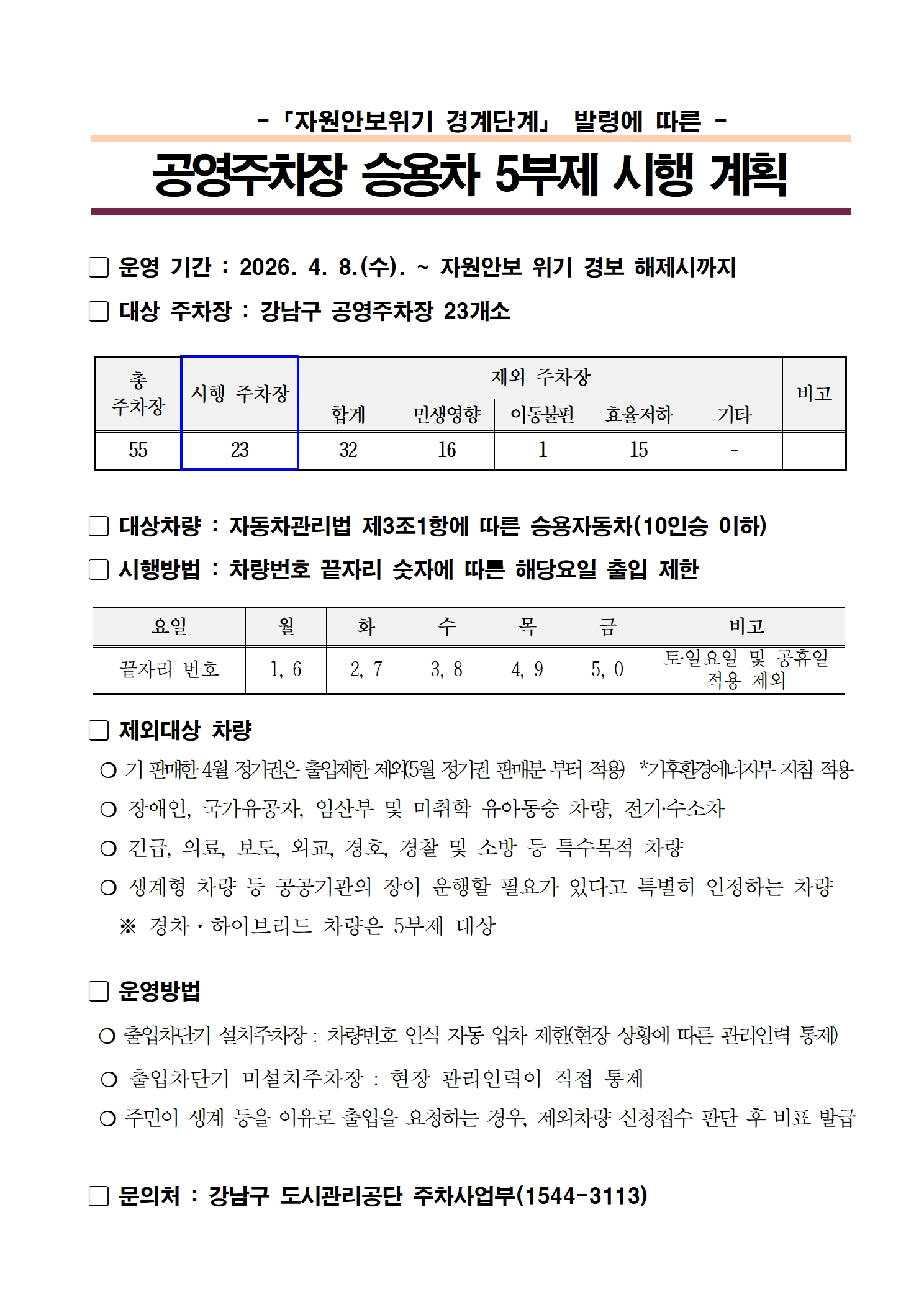 정부의 원유 자원 안보 위기 ‘경계’ 단계 발령으로 인해 2026. 4. 8.(수)부터 우리 구 공영주차장(23개소)에 대한 승용차 5부제가 전격 시행됩니다.