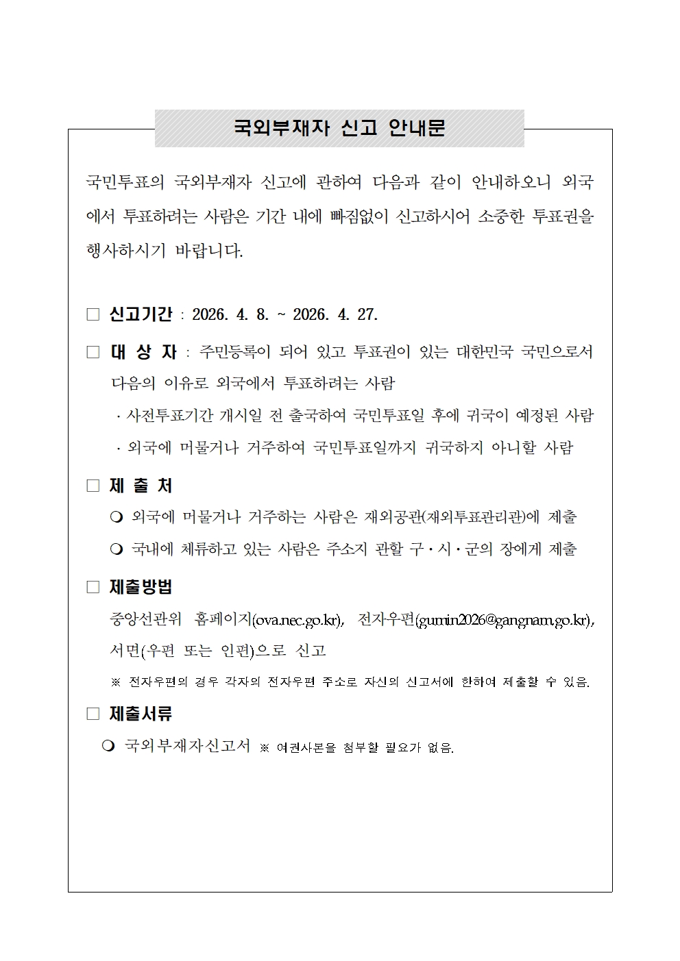 국민투표 국외부재자 신고 접수 안내 (2026. 4. 8.~2026. 4. 27.)