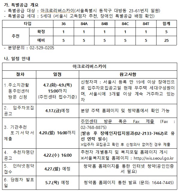아크로리버스카이 서울시 장애인특별공급 기관추천 안내