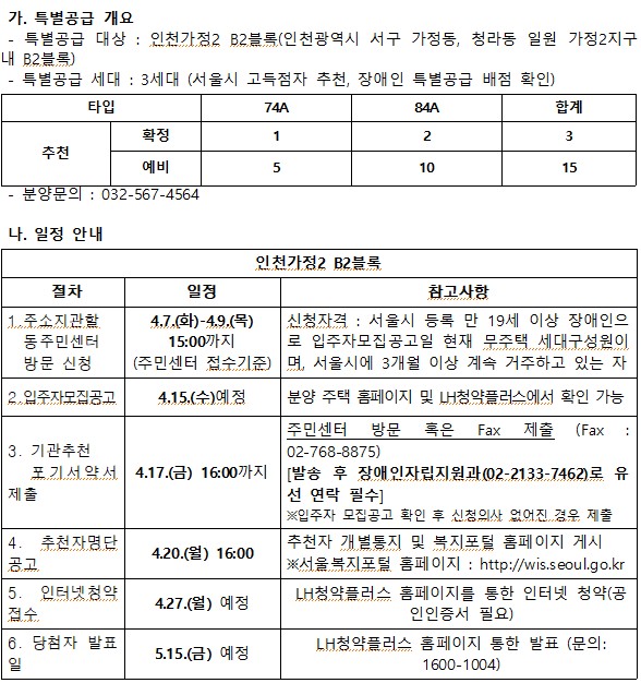 인천가정2 B2블록 서울시 장애인 특별공급 기관추천 안내