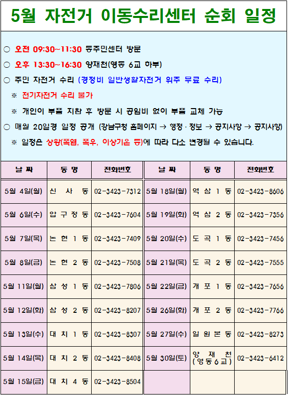 2026년 자전거 이동수리 센터 5월 순회일정 안내