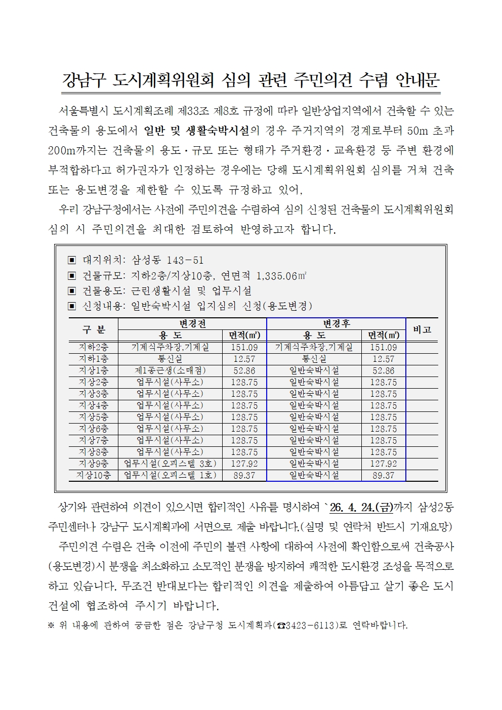 숙박시설 입지심의 신청에 따른 주민의견수렴 안내