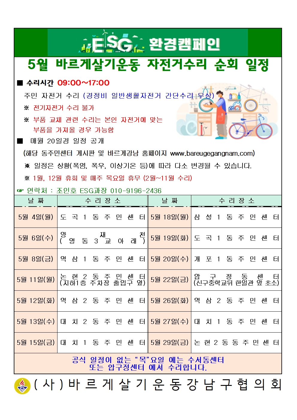 2026년 5월 바르게살기운동강남구협의회 자전거 수리 순회 일정 안내