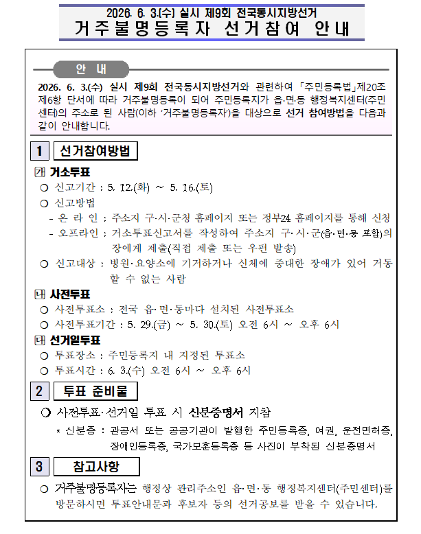 거주불명등록자 대상 선거참여 안내