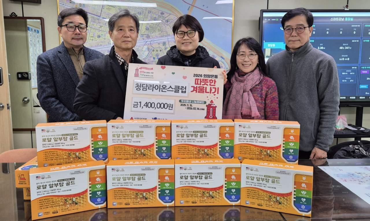 - 일 시 : 2026. 2. 6.(금) - 기탁단체 : 청담라이온스클럽(회장 홍석찬) - 기탁물품 : 건강기능식품(알부민) 1,400,000원 상당 이웃돕기에 함께해 주신 따뜻한 마음에 깊이 감사드립니다. 관내 도움이 필요한 어려운 이웃에게 소중하게 전달하도록 하겠습니다.