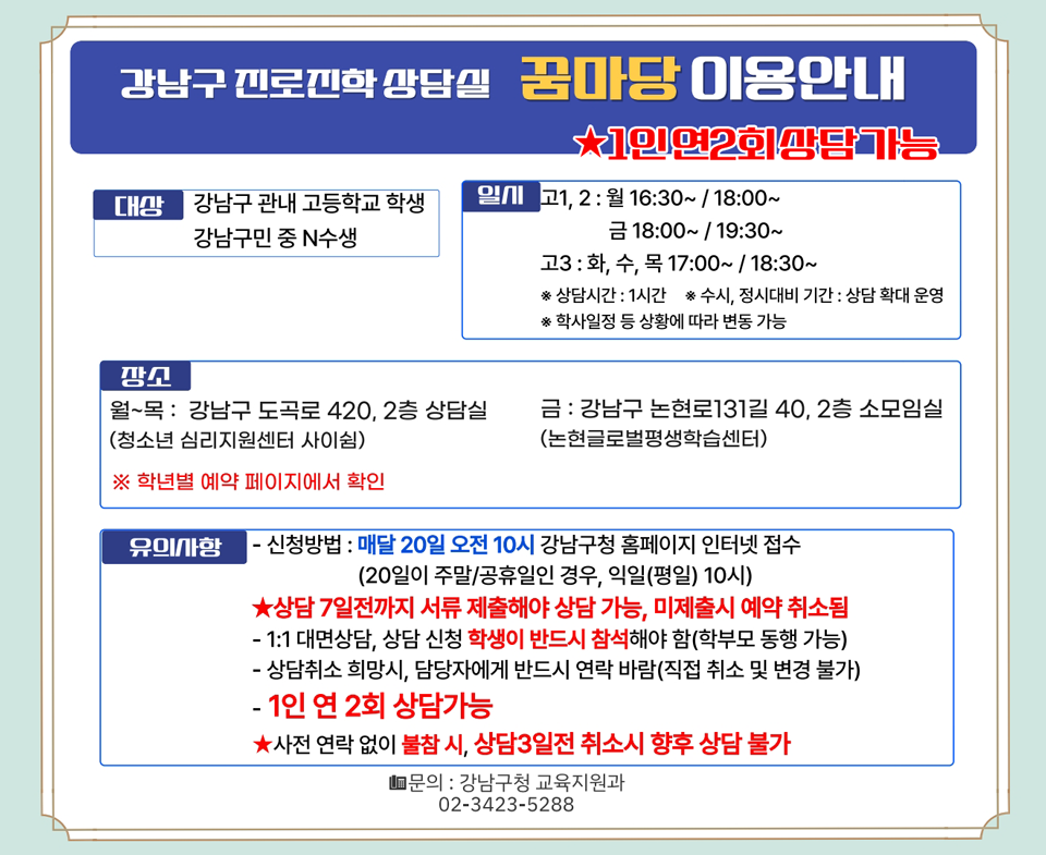 - 수시 및 정시 대비 상담기간에는 고3 및 N수생을 확대 상담합니다.