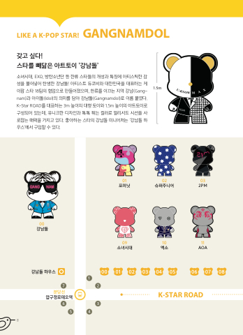 이팝 스타 18팀의 협업으로 만들어졌으며 한류를 이끄는 지역 강남(Gang- 1 1 5m nam)과 아이돌(Idol)의 의미를 담아 강남돌(Gangnamdol)로 이름 붙였다 K-Star ROAD를 대표하는 3m 높이의 높이의 대형 토이와 1 5m 높이의 높이의 아트토이로 구성되어 있는데 유니크한 디자인과 톡톡 튀는 컬러로 멀리서도 시선을 사