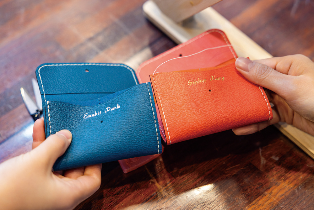 바느질 작업이 마무리될 즈음, 문구를 새길 차례가 왔다. 각자 가죽에 새길 문구를 고르면 가죽 각인 도구인 불박기의 열을 이용해 문구를 새기는 작업이다. 어머니께 카드지갑을 드릴 거라는 김아름 주무관은 어머니의 영문 이름을, 아들에게 선물로 주고 싶다는 송나영 주무관은 ‘Good Luck’을, 카드지갑이 꼭 필요하다던 강신혜, 박은빛 주무관은 자신의 이름을 새겼다. 유수환 주무관은 “카드지갑을 제가 쓸지, 선물할지는 좀 더 고민해야겠어요. 일단 행운을 부르는 주문으로 새길 거예요”라며 급하게 핸드폰으로 문구를 검색하고는 ‘항상 행복하라’라는 뜻의 주문인 ‘Castropollux’를 새겼다. 가죽에 금박, 은박으로 문구를 새기자 미완성의 카드지갑이 한층 멋스러워졌다.
