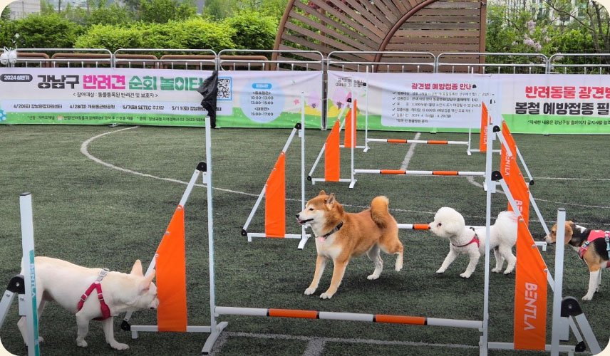 이날 반려견 순회 놀이터를 찾아온 반려견은 100여 마리. 오전 10시부터 오후 5시까지 광견병 접종을 완료하고 동물 등록된 반려견들이 목줄에서 해방되어 그동안 묵혀왔던 욕구를 마음껏 해소한다. 올해 들어 다섯 번째 열린 반려견 순회 놀이터가 반려인들로부터 큰 호응을 얻고 있다. 지난 4월, 강남환경자원센터 풋살장을 시작으로 지금껏 반려견 380여 마리, 반려인 540여 명이 참가했으며, 11월에도 두 차례 더 열린다. 반려견 순회 놀이터에선 발도장 찍기, 펫티켓 교육, 포토존 등 다양한 이벤트가 제공되어 반려견과 반려인들에게 잊을 수 없는 멋진 경험을 선사했다.