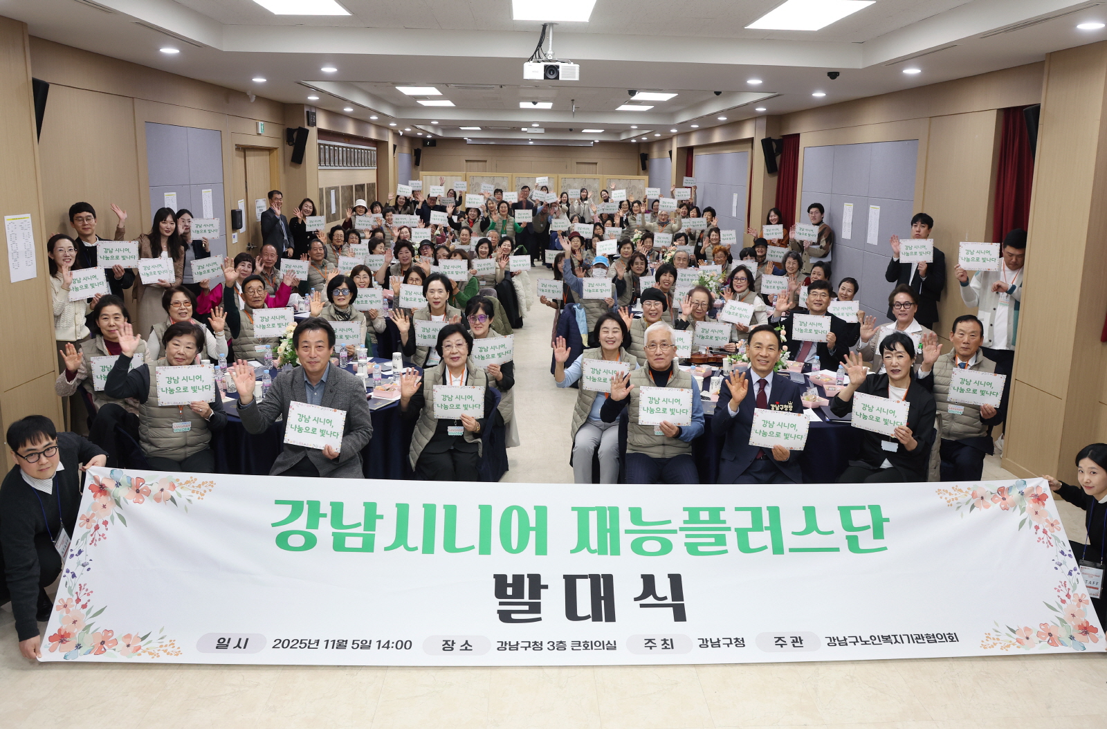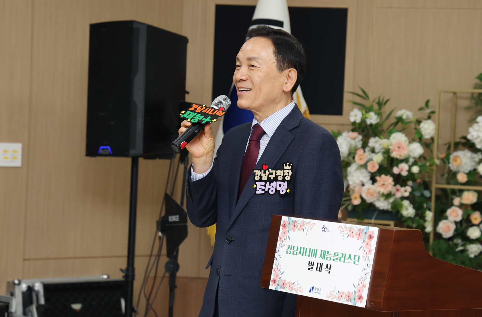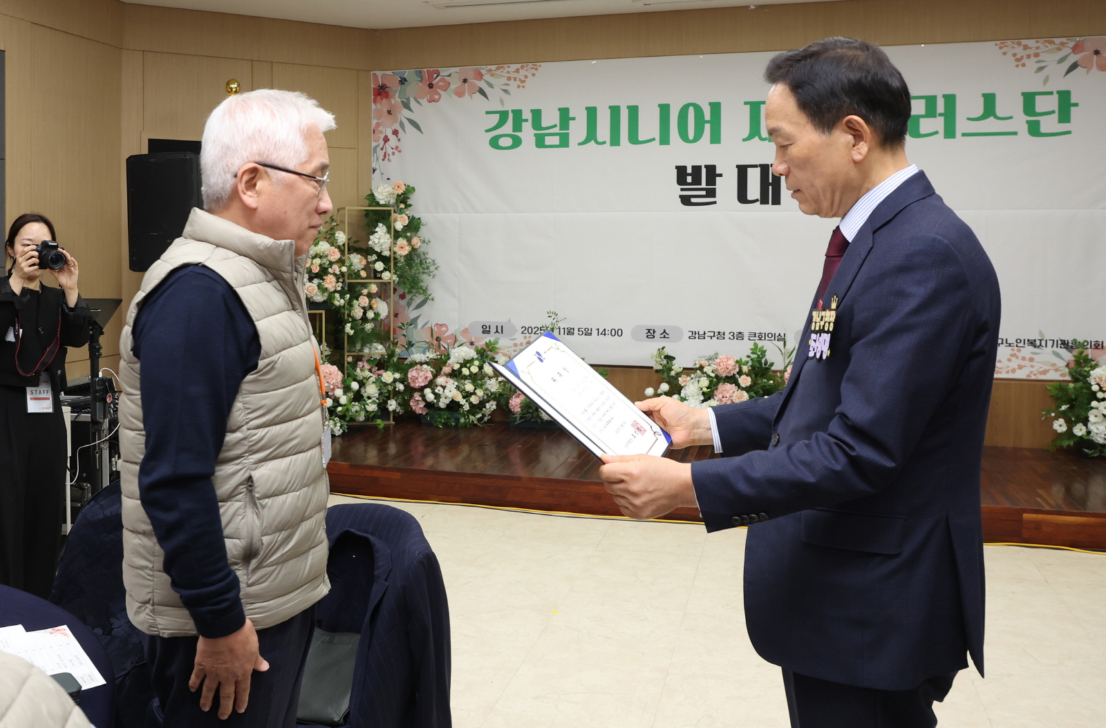 조성명 구청장이 5일 구청 본관 큰회의실에서 열린 ‘강남 시니어 재능플러스단’ 발대식에 참석해 분야별 대표단원들에게 위촉장을 수여하고 선발된 단원들을 격려했다. ‘강남 시니어 재능플러스단’은 지난 9월부터 공개모집과 선발과정을 거쳐 보건·의료, 문화·예술, 교육 등 3개 분야에서 100명의 단원을 선발했다. 단원들은 각 분야의 전문성을 기반으로 지역 내 유관기관 및 시민단체와 협력해 건강상담, 문화예술 등 다양한 공익서비스를 제공할 예정이다.