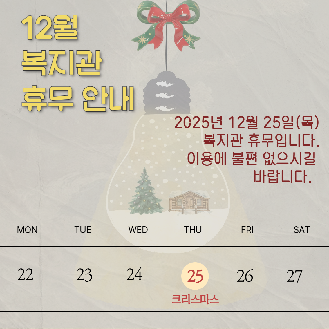 안녕하세요! 12월 25일은 성탄절 공휴일로 인한 복지관 휴관입니다. 이 점 꼭 참고하셔서, 기관 이용에 불편이 없으시길 바랍니다. 🎄🤍따뜻하고 즐거운 연휴 보내시길 바랍니다. 🎄🤍