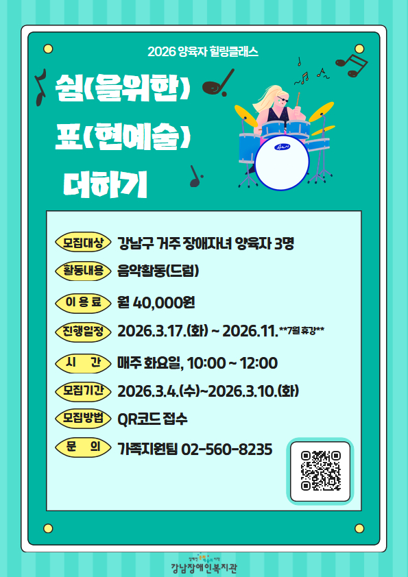 쉼(을위한)표(현예술) 더하기는 여가시간을 활용해 양육자 간 소통의 시간을 가지며 음악(드럼)활동을 통해 스트레스를 완화를 지원하는 프로그램입니다.