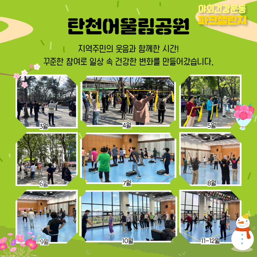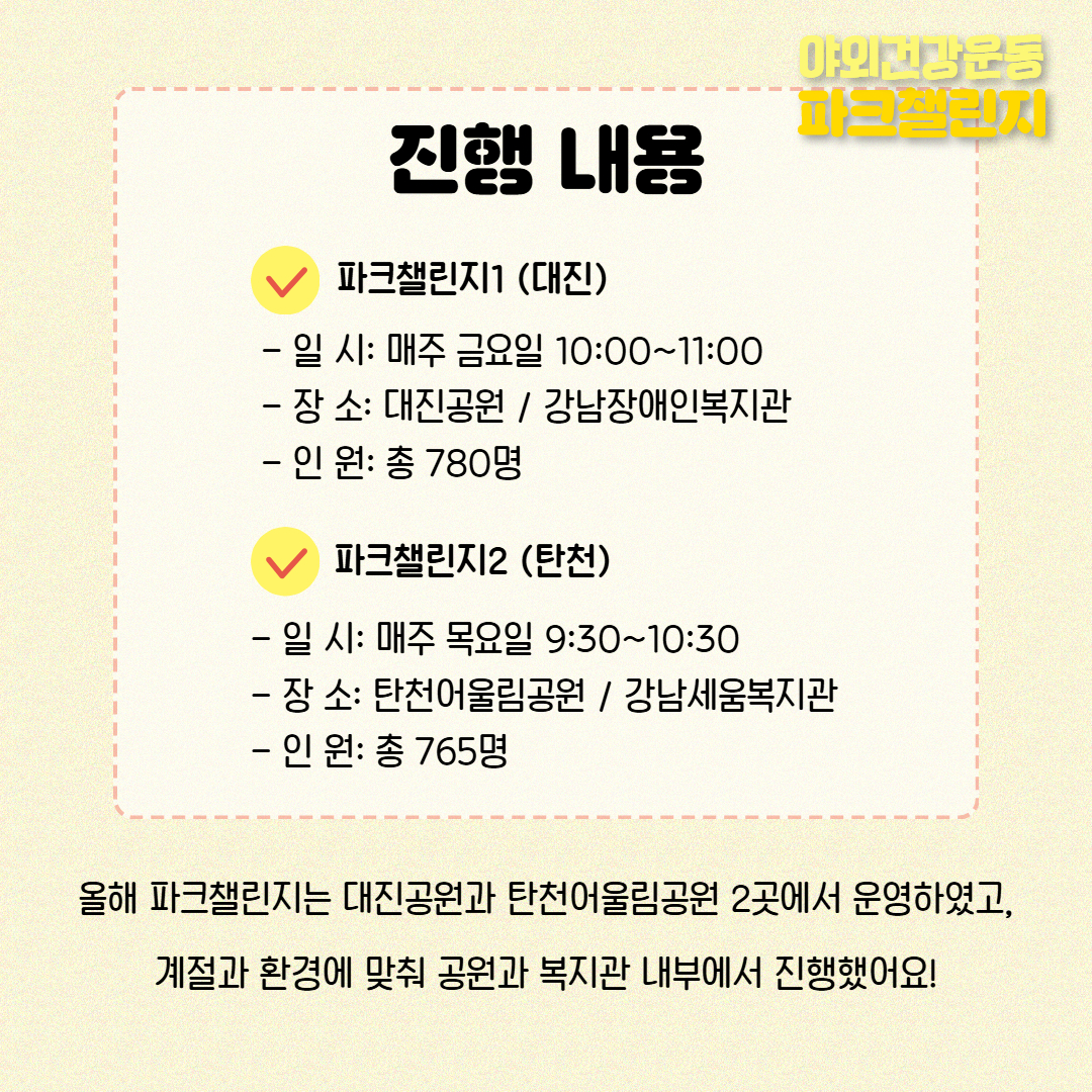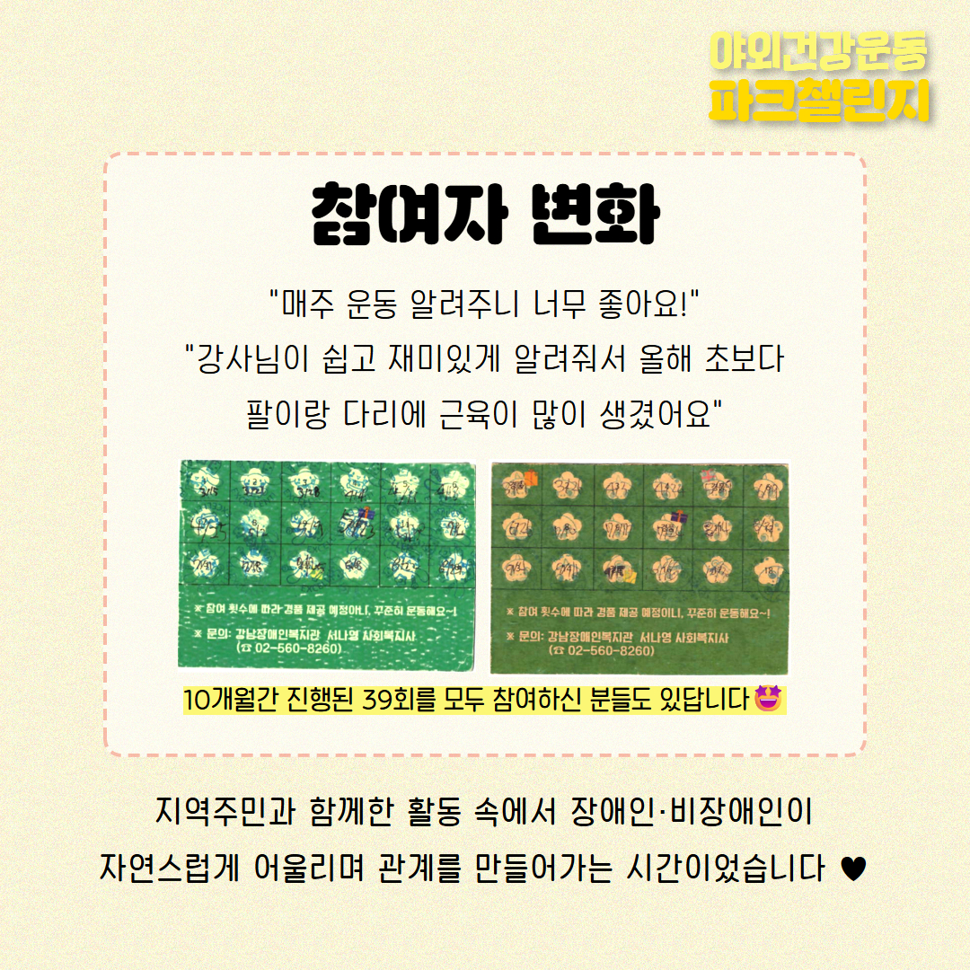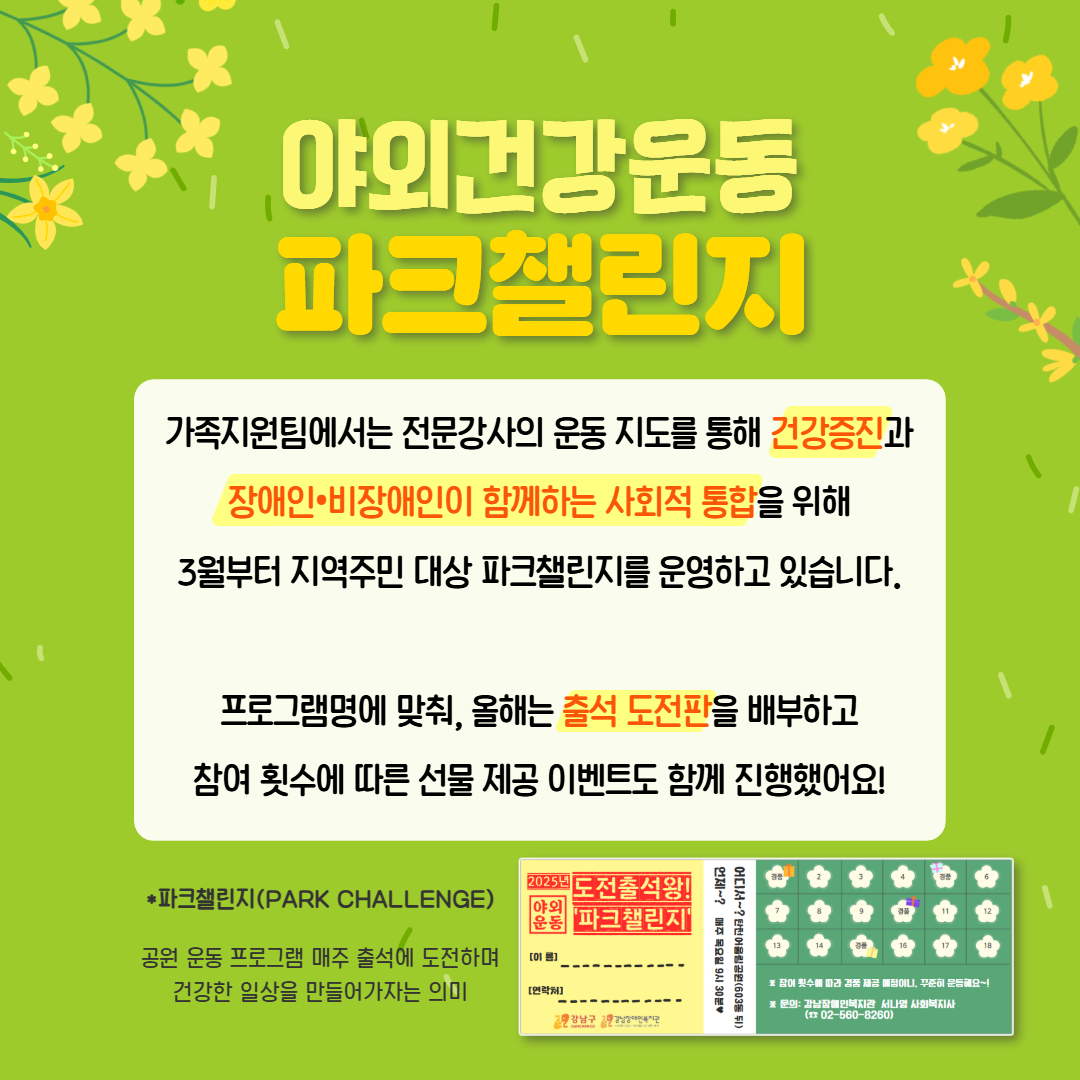 가족지원팀은 강남구의 지원으로 3월부터 12월까지 야외운동 파크챌린지를 진행했습니다.