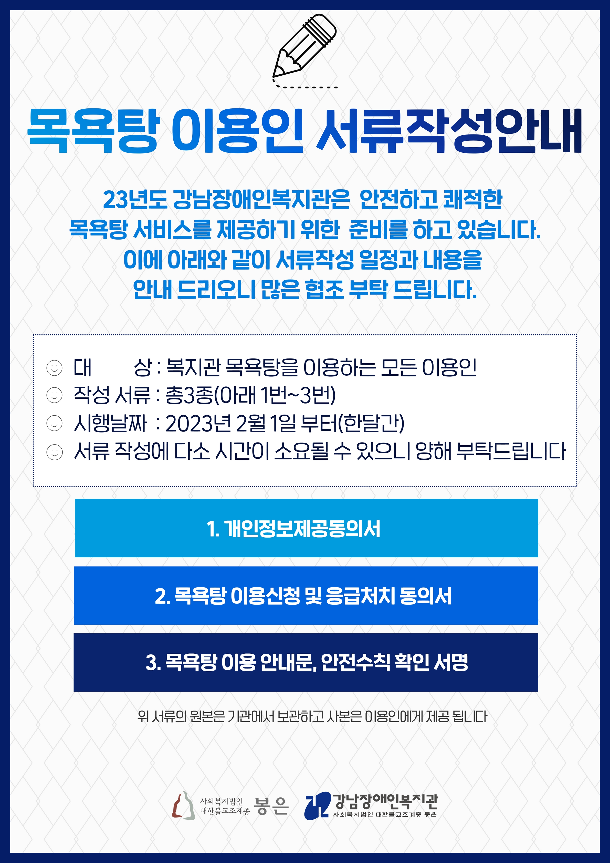 그래서 강남장애인복지관에서는 이용인의 안전하고 쾌적한 장애인목욕탕 이용을 위하여