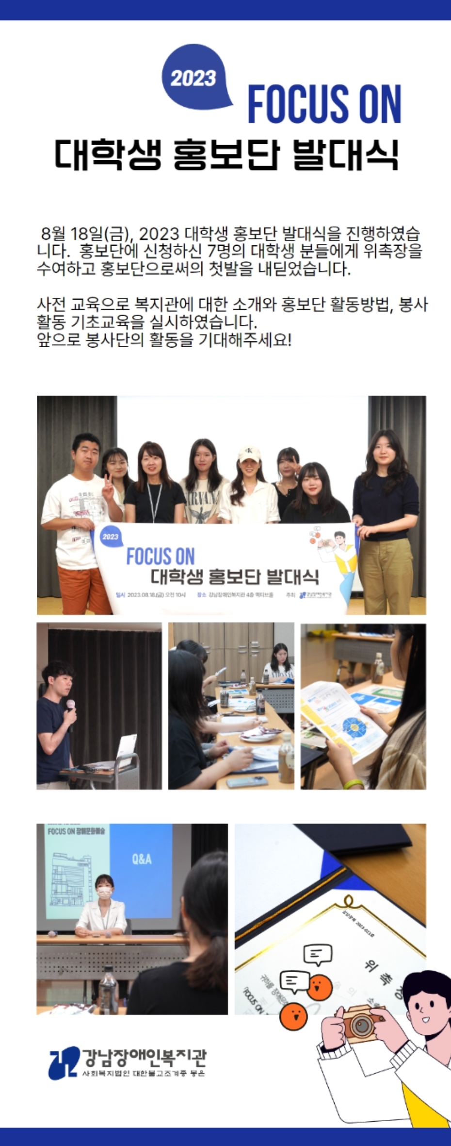 8월 18일(금), 2023 대학생 홍보단 발대식을 진행하였습니다. 홍보단에 신청하신 7명의 대학생 분들에게 위촉장을 수여하고 홍보단으로써의 첫발을 내딛었습니다.