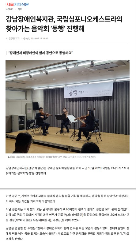 바로가기: 강남장애인복지관, 국립심포니오케스트라의 찾아가는 음악회 '동행'진행해- 서울자치신문