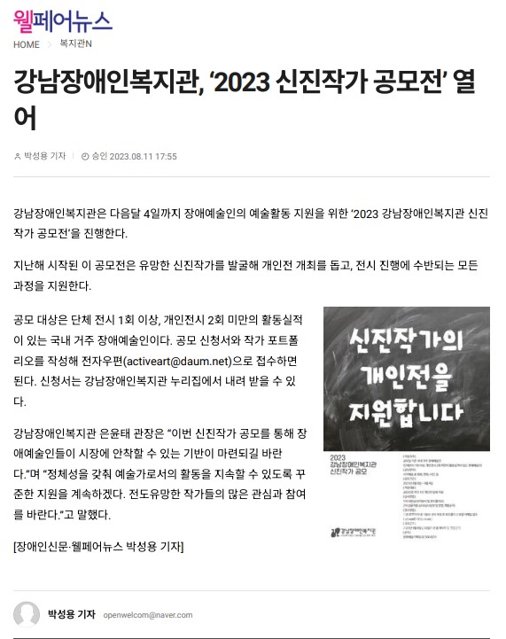 바로가기: 강남장애인복지관, ‘2023 신진작가 공모전’ 열어 - 웰페어뉴스