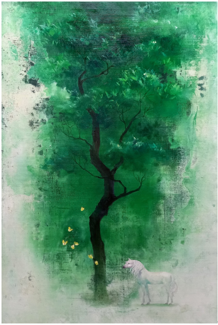 「하얀 발굽과 작은 날개」 연작에서는 백마와 나비가 서로 다른 차원의 세계를 잇는 매개체로 등장합니다. 흘러내린 아크릴의 우연적 흔적 위에 정교한 오일 묘사가 더해지며 몽환적이면서도 선명한 분위기가 형성됩니다. 그 안에서 백마와 나비는 현실에서 이상을 향한 세계로 시선을 이끄는 안내자처럼 화면 속에 자리합니다.