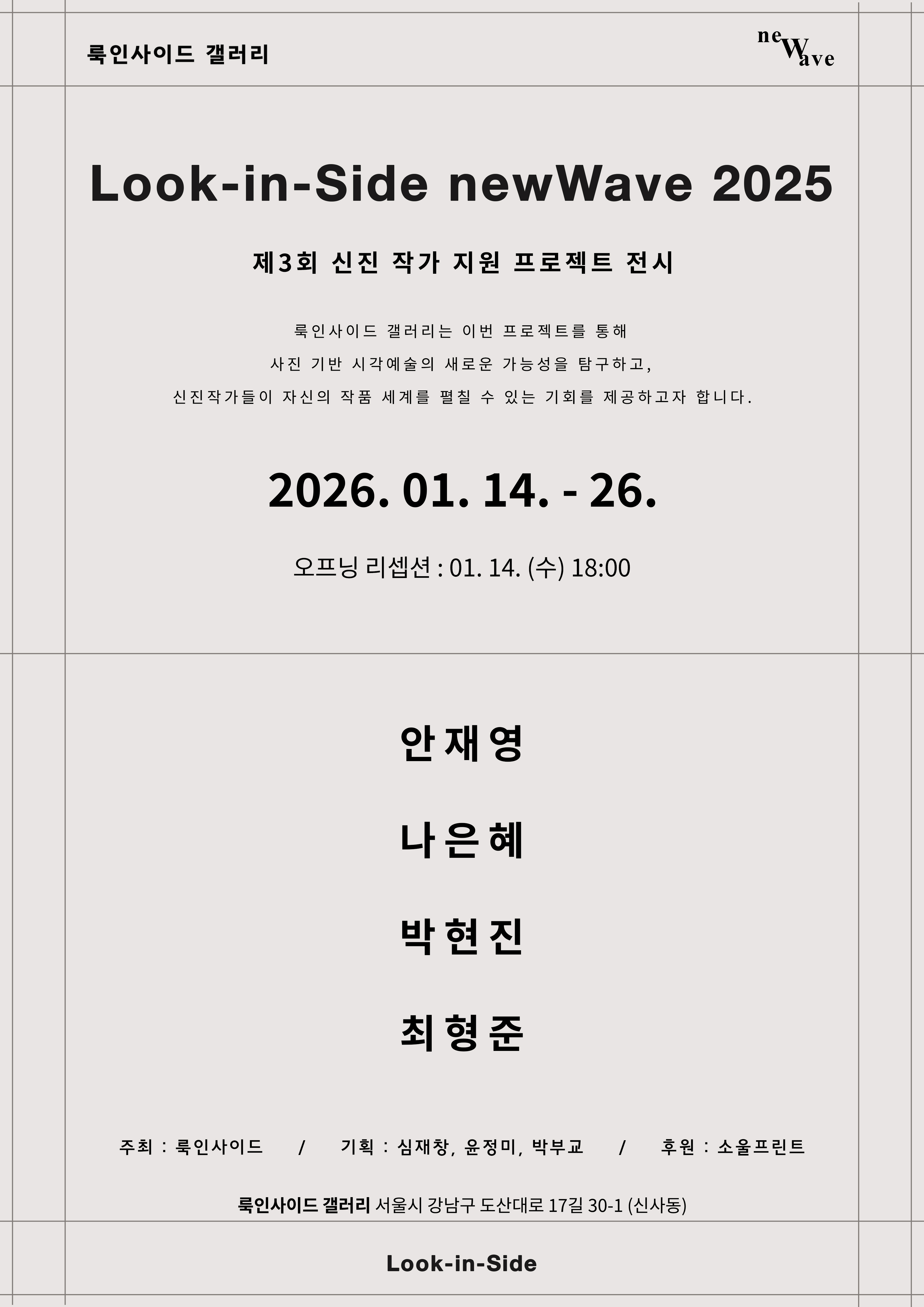 룩인사이드 갤러리가 2026년 새해를 맞아 《룩인사이드 뉴웨이브 2025》(Look-in-Side NewWave 2025) 제3회 신진 작가 지원 프로젝트 전시를 개최합니다. 지난해 8월 심재창, 윤정미, 박부교 심사위원의 공정한 심사를 통해 선정된 네 명의 시각예술 작가가 각기 다른 감각과 표현으로 자신의 세계를 선보입니다.특히 프리젠테이션에서 우수상을 수상한 안재영 작가에게는 소울프린트의 제작 지원이 제공되어작품 제작에 실질적인 도움이 되었습니다.