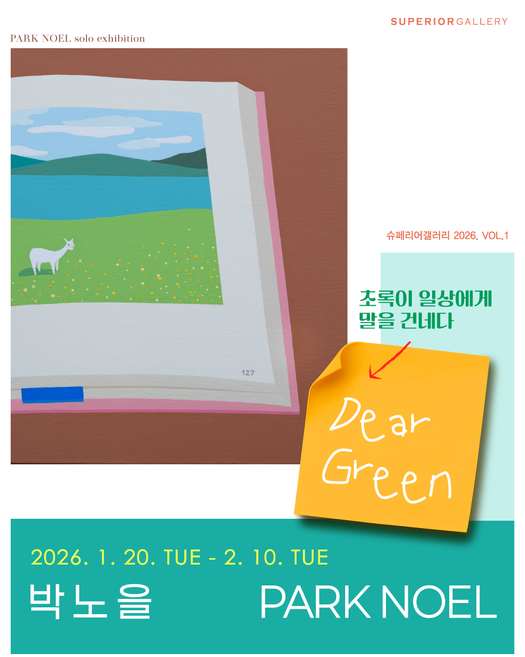 슈페리어갤러리는 2026년 1월, 일상의 풍경 그리고 식물을 통해 감정과 관계의 흐름을 회화로 풀어내는 박노을 작가의 개인전 《Dear Green : 초록이 일상에게 말을 건네다》展을 개최합니다. 이번 전시는 집 안의 친근한 오브제에서 출발한 작가의 시선이 식물과 주변 풍경, 그리고 외부 자연으로 점차 확장되며 서로 다른 장면들을 하나의 흐름으로 연결되는 과정을 보여주는 전시입니다.