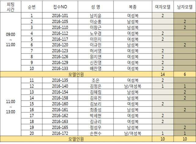 ※ 순서는 수험번호 순이며, 3차 본선런웨이 심사전형은 모델과 피팅작업 후 10. 3(목) 실시됩니다.