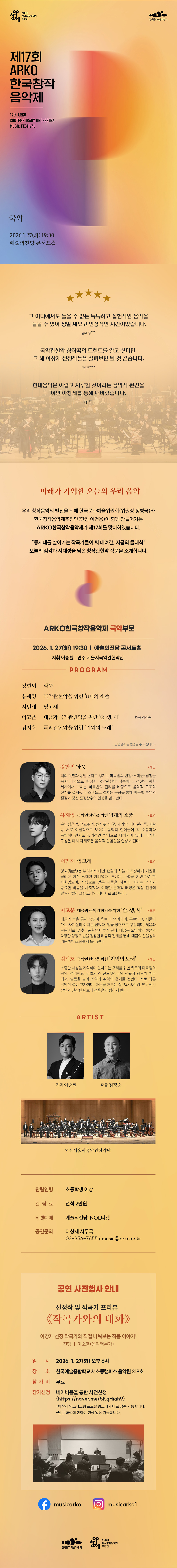 ARKO한국창작음악제(아창제)는 한국문화예술위원회를 주최로 매년 공모를 통해 국악·양악 창작관현악 작품을 선정하여 연주회를 개최하고 있습니다.