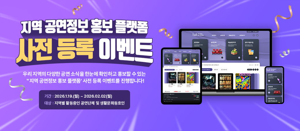 전국 지역공연 정보를 한곳에서 확인하고 홍보할 수 있는 플랫폼의 사전등록 이벤트 소식을 전달드립니다.