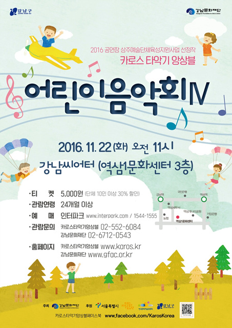 어린이 음악회는 미취학 아동들과 함께 참여 할 수 있는 프로그램으로 어린이들에게 익숙하지 않은 타악기 공연의 흥미와 재미를 유발하고 곡에 맞는 캐릭터 인형의 이벤트를 통하여 어린이들이 체험 할 수 있는 교육 예술 공연
