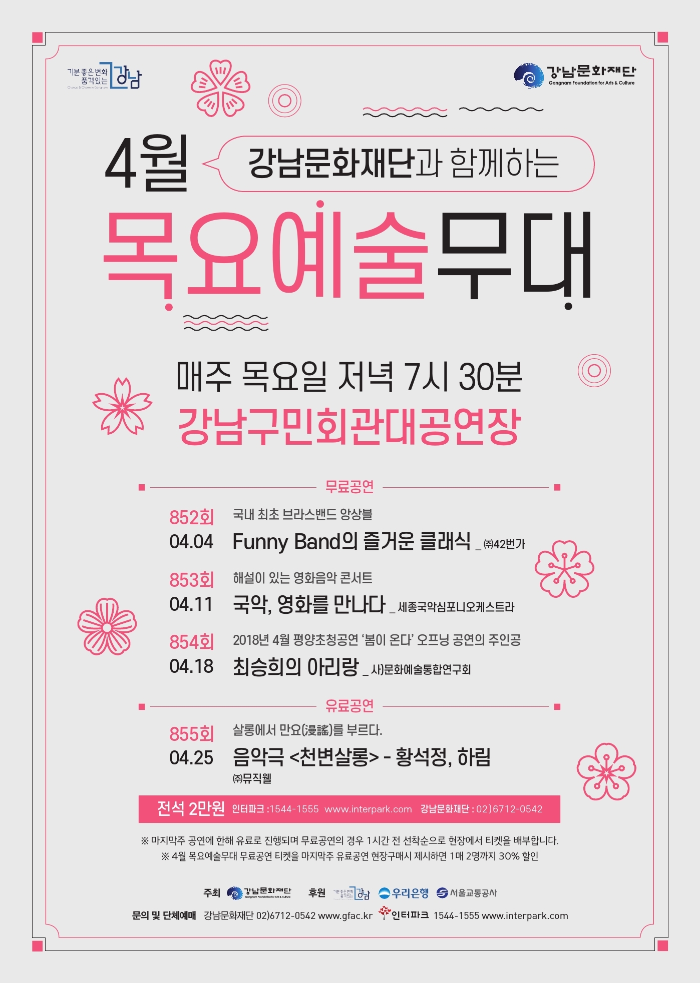 예매 : 전화 또는 강남문화재단 홈페이지 http://www.gfac.kr/client/perform/freeperformance.do