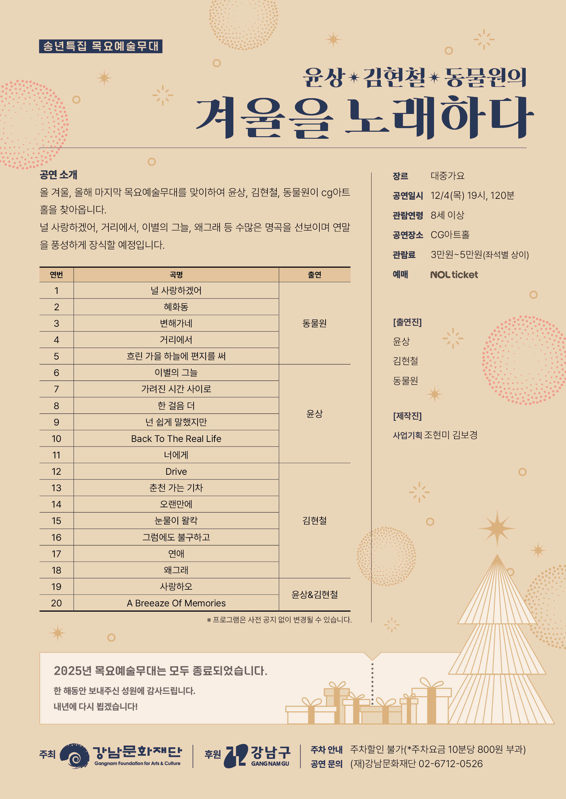 ![[제1008회 목요예술무대] 시리즈 파장 「윤상&김현철&동물원의 겨울을 노래하다」 전자점자뷰어보기](/assets/images/common/braille_btn.png)