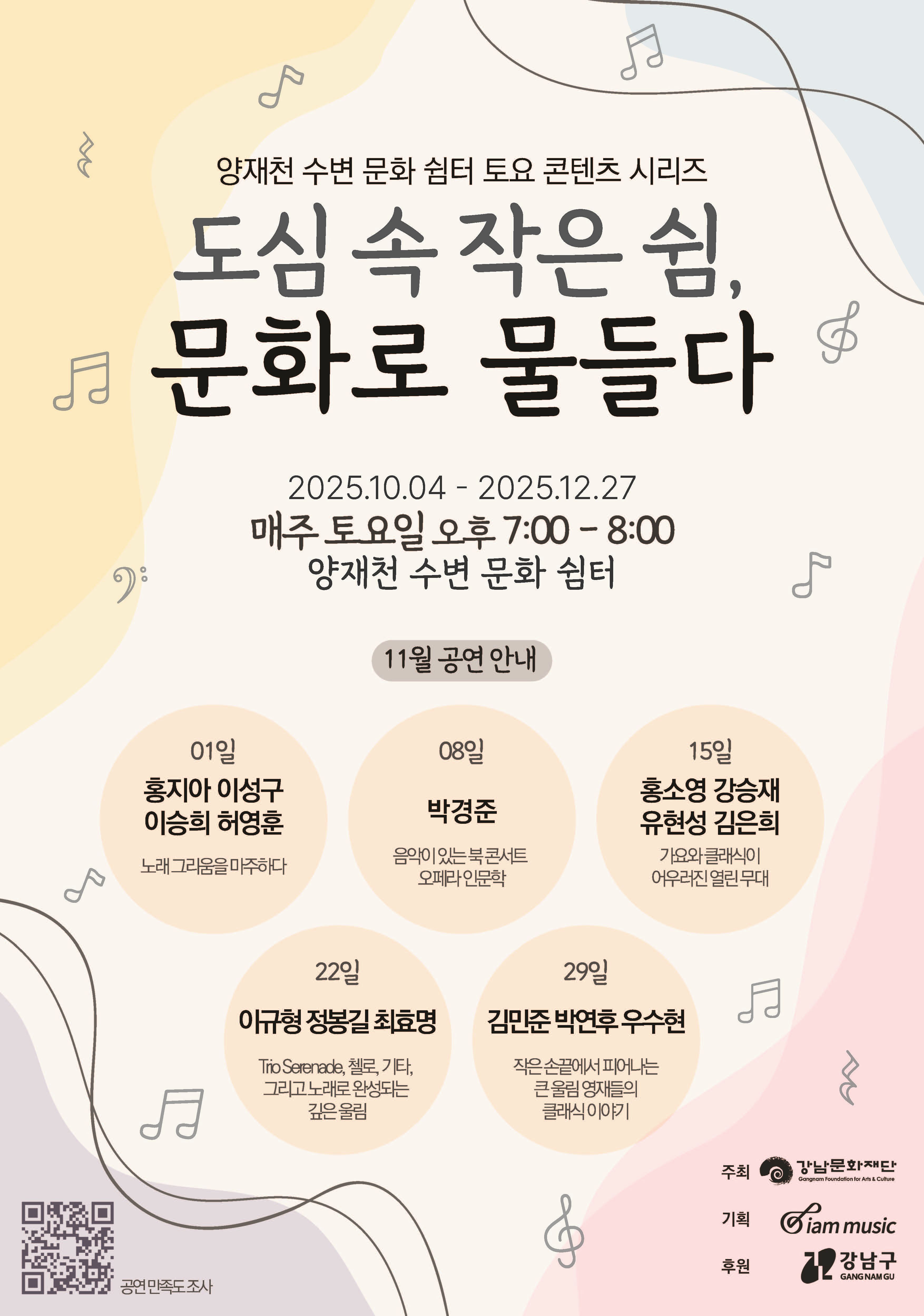도심 속 작은 쉼, 문화로 물들다 양재천 수변 문화 쉼터 | 11월 공연정보 -