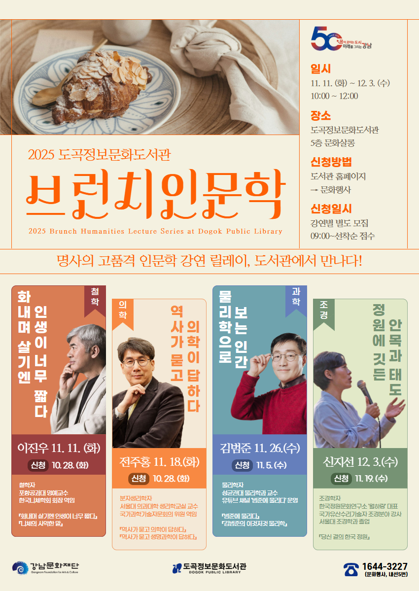 2025 도곡정보문화도서관 브런치 인문학 2025.11.11.(화) ~ 12.3.(수), 10:00 - 12:00 | 도곡정보문화도서관 5층 문화살롱 -