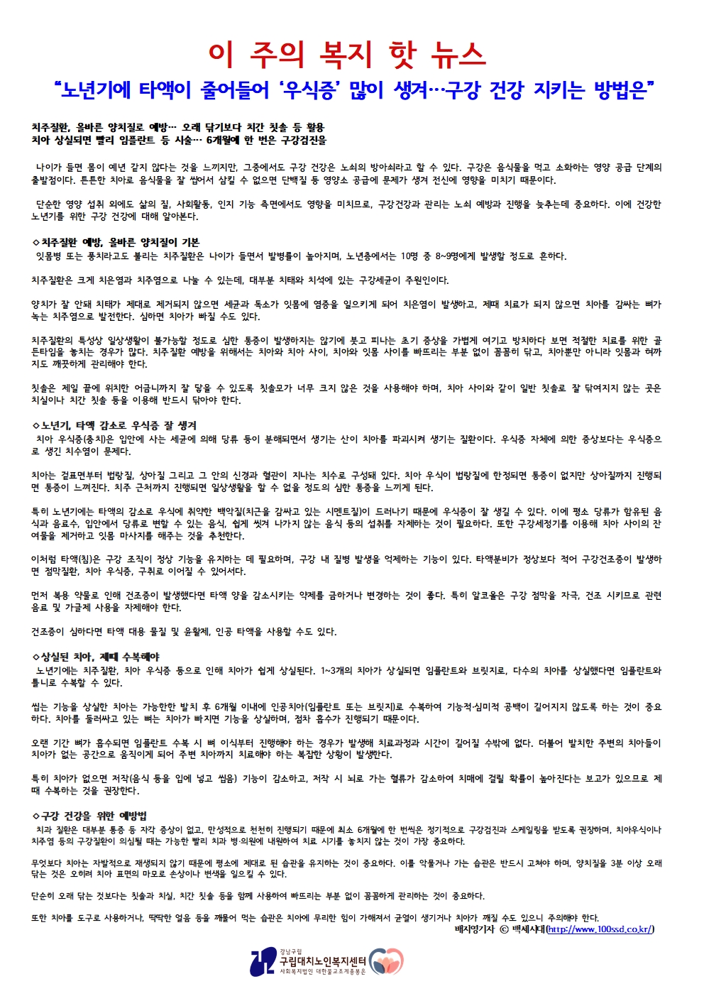 [복지뉴스] 노년기에 타액이 줄어들어 우식증 많이 생겨, 구강 건강 지키는 방법은