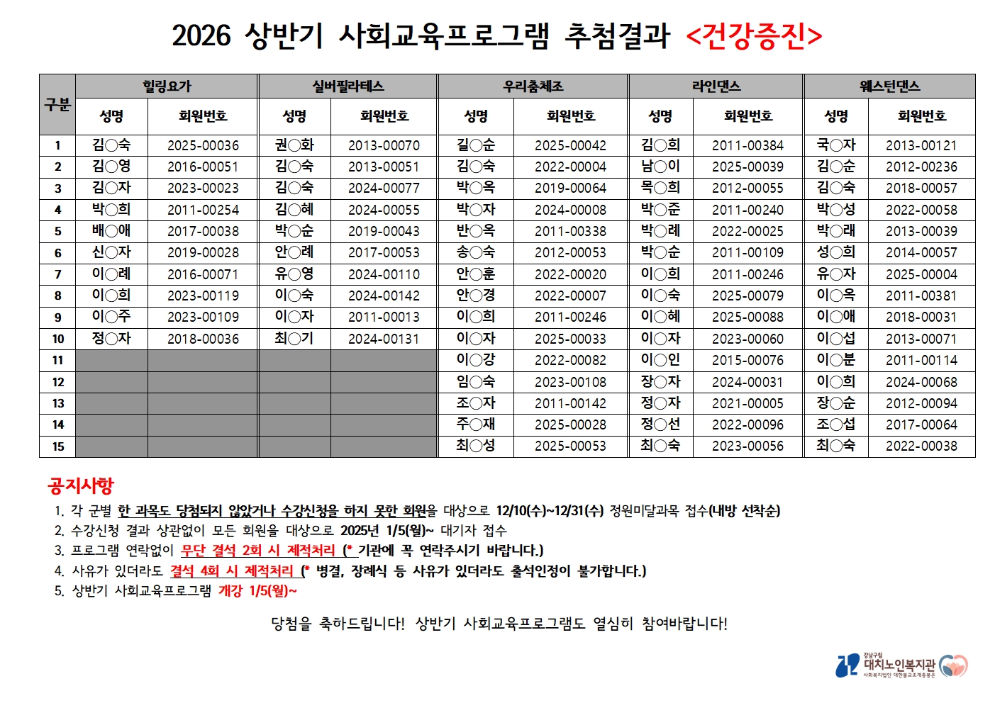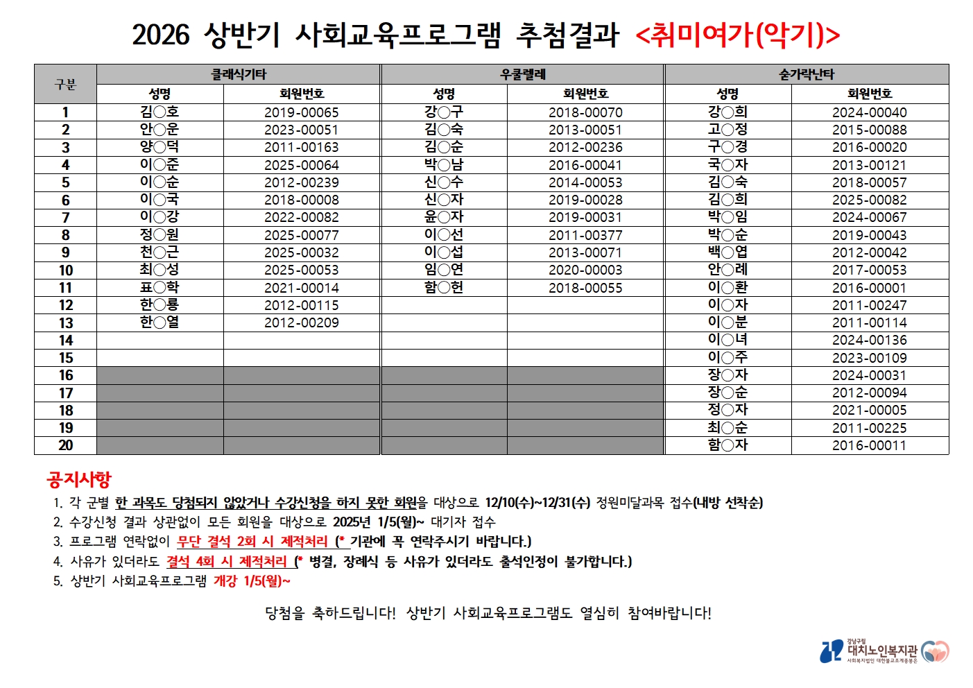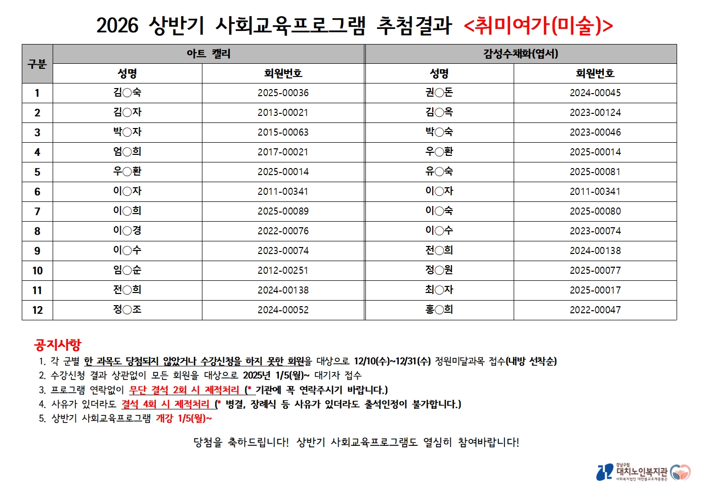 [복지]2026년 상반기 사회교육프로그램 추첨결과