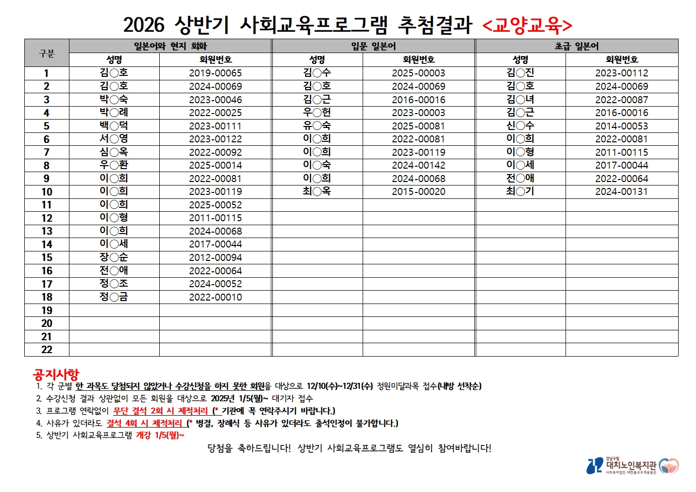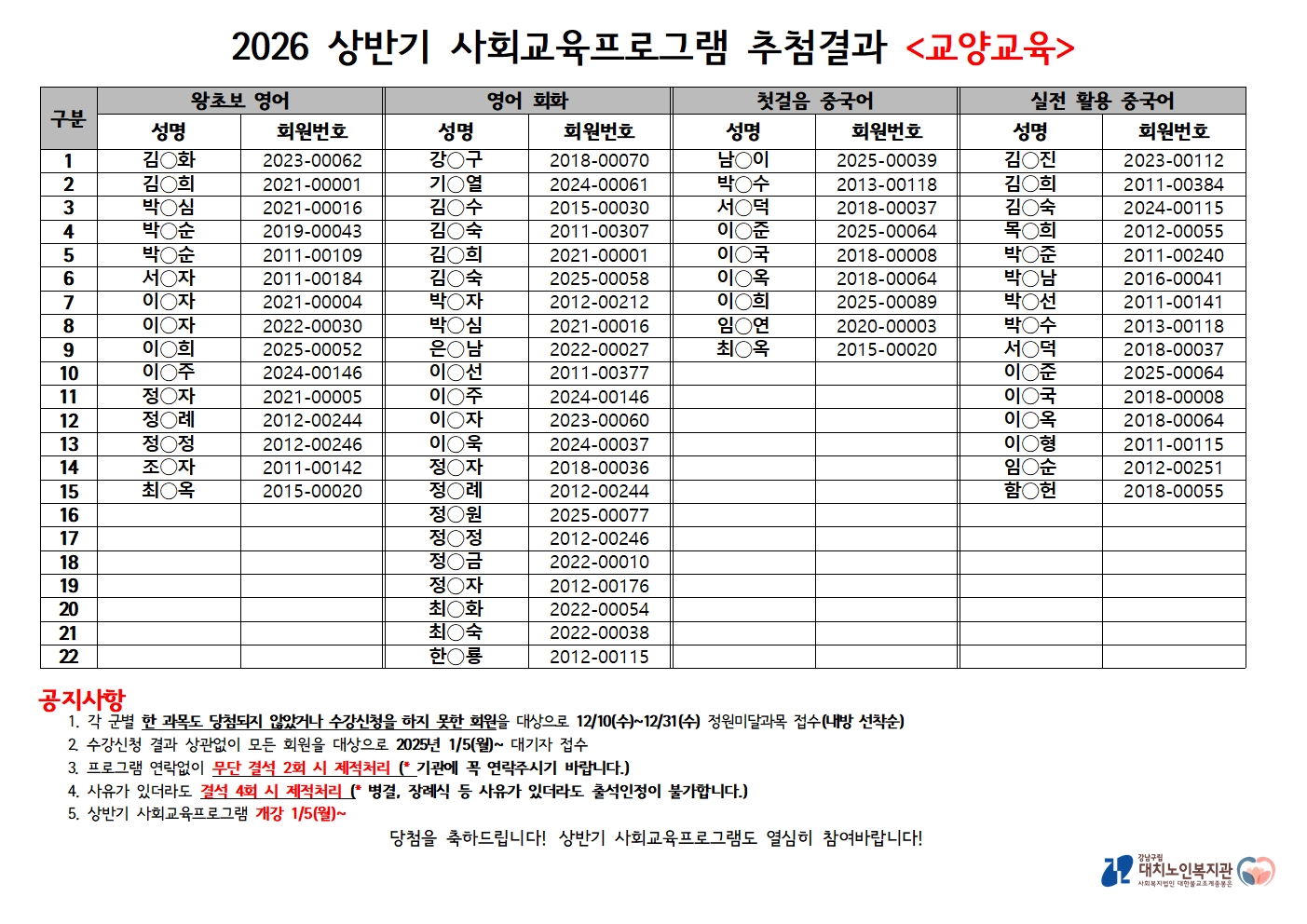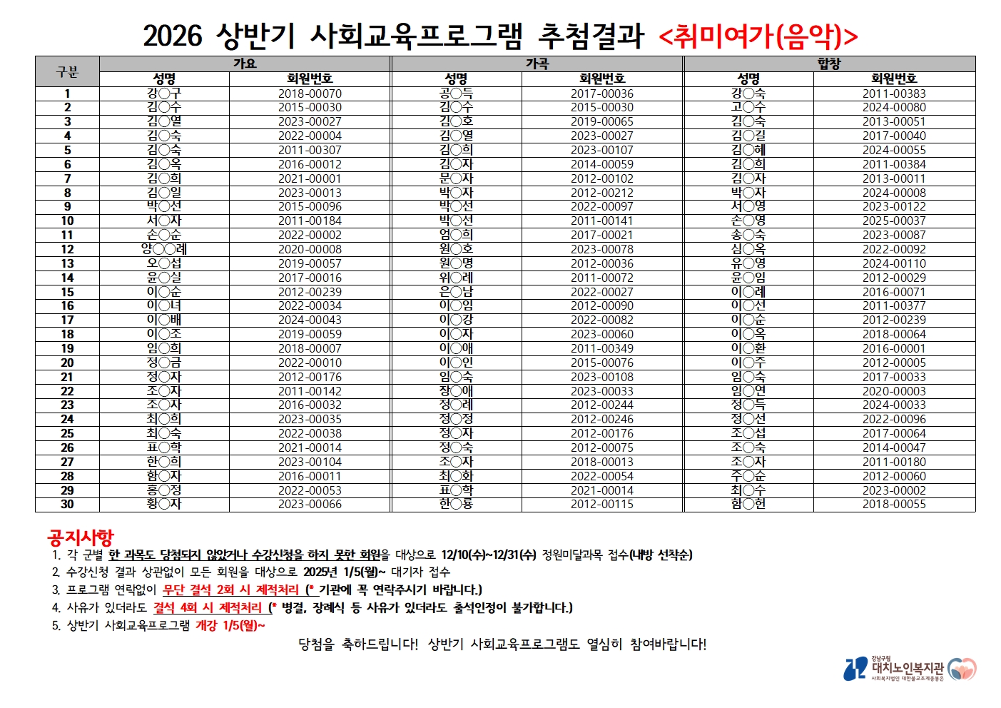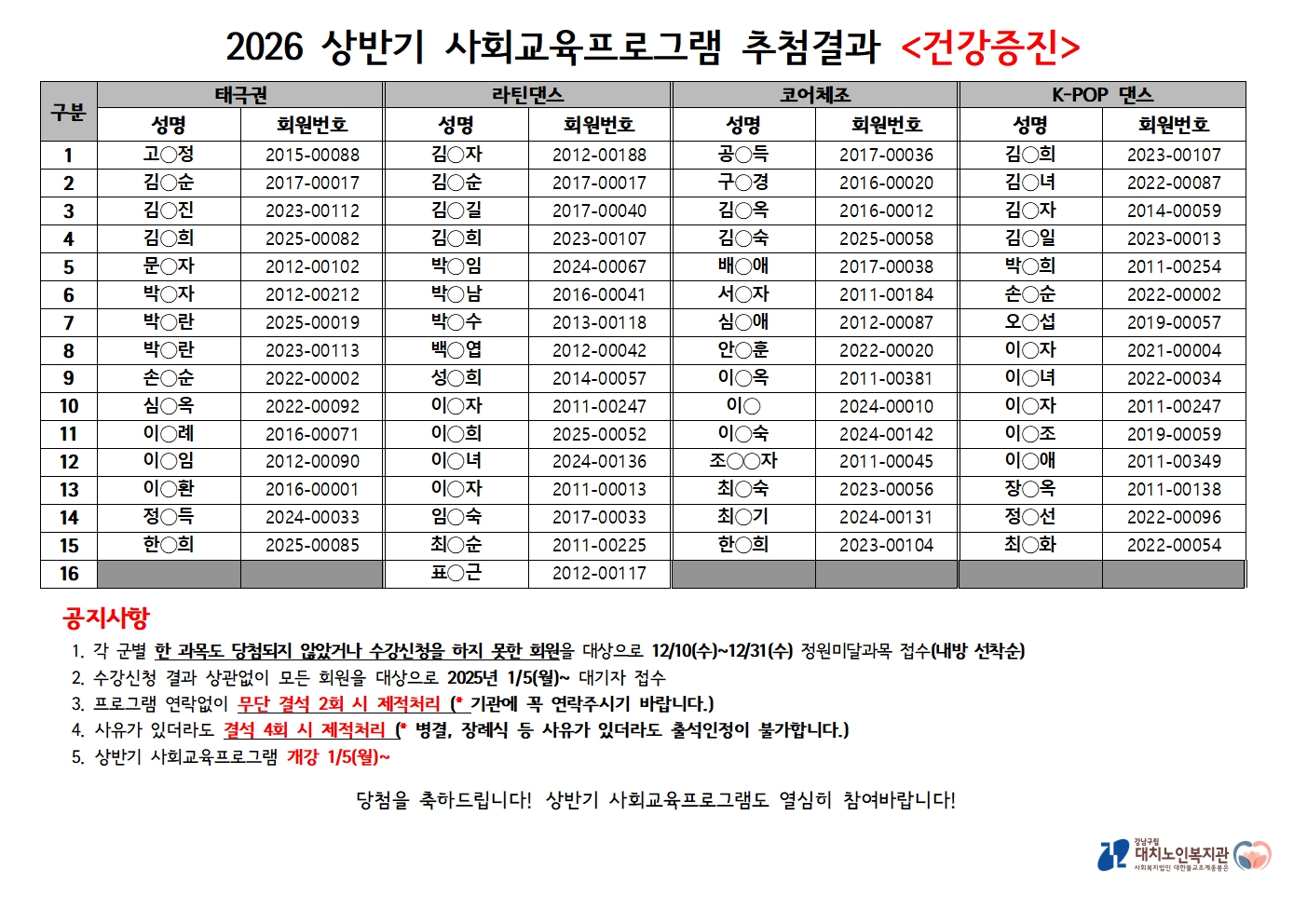 [복지]2026년 상반기 사회교육프로그램 추첨결과